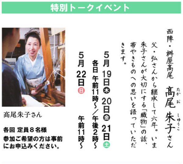 たかはし『染織ミュージアム』   西陣・桝屋髙尾 『髙尾 朱子』さんの   特別トークイベント開催のお知らせです。   参加ご希望の方は、ホームページもしくは   お電話にてお申し込み下さいませ。   各回、定員8名となっております。   定員の際には、時間もしくは日時の変更を   お願いする場合がございます。   あしからずご了承下さいませ。